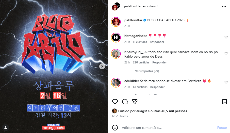 A publicação, feita em português e coreano, levou os fãs do NMIXX — grupo que colaborou recentemente com Pabllo — a especularem sobre uma possível participação do sexteto no bloco.