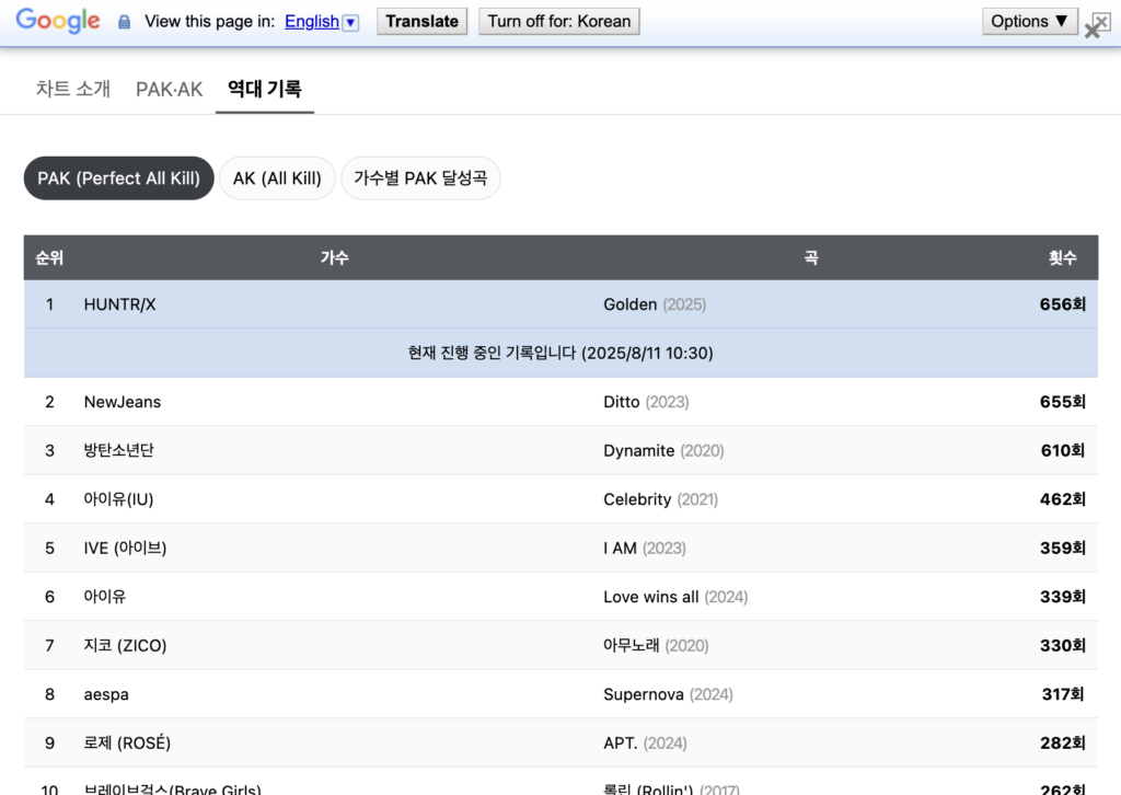 Recentemente, a faixa “Golden”, da trilha sonora do filme da Netflix “Guerreiras do K-pop”, se tornou a música com o maior número de Perfect All-Kills (PAKs) já registrados.