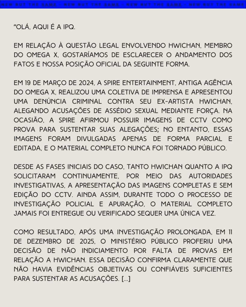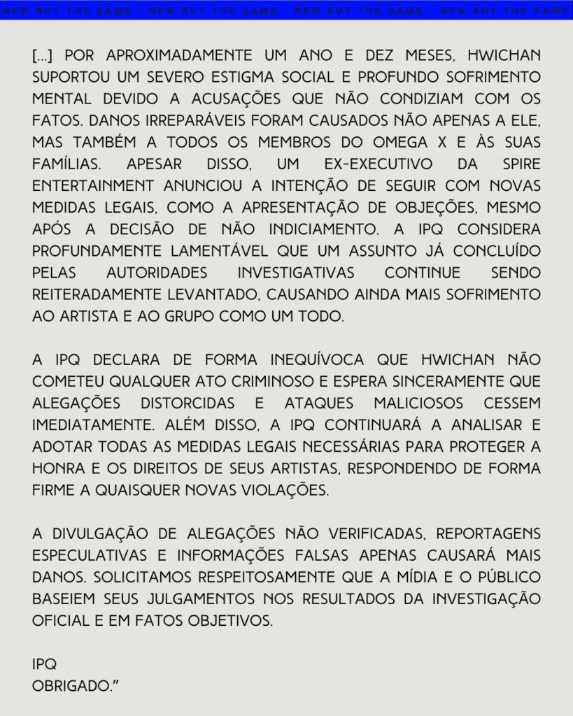 Em um comunicado oficial divulgado nesta quarta (17), a atual empresa do OMEGA X, IPQ, informou que o Hwichan foi inocentado das acusações de assédi0 sexu4l envolvendo a ex-CEO de sua antiga agência.