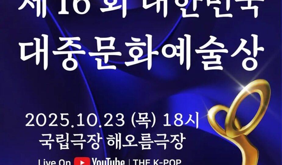 A cerimônia do “Prêmio de Cultura Popular e Artes da Coreia”, ou, originalmente “2025 대한민국 대중문화예술상”, que acontecerá no dia 23 deste mês, em Seul, no Haeoreum Theater (해오름극장), que fica dentro do Teatro Nacional, é uma premiação concedida pelo governo para reconhecer artistas populares (cantores, atores, comediantes, dubladores, etc.) e colaboradores da indústria cultural/popular. Esta será a 16ª edição, organizada pelo Ministério da Cultura, Esportes e Turismo da Coreia (문화체육관광부), em conjunto com a Korea Creative Content Agency (한국콘텐츠진흥원).