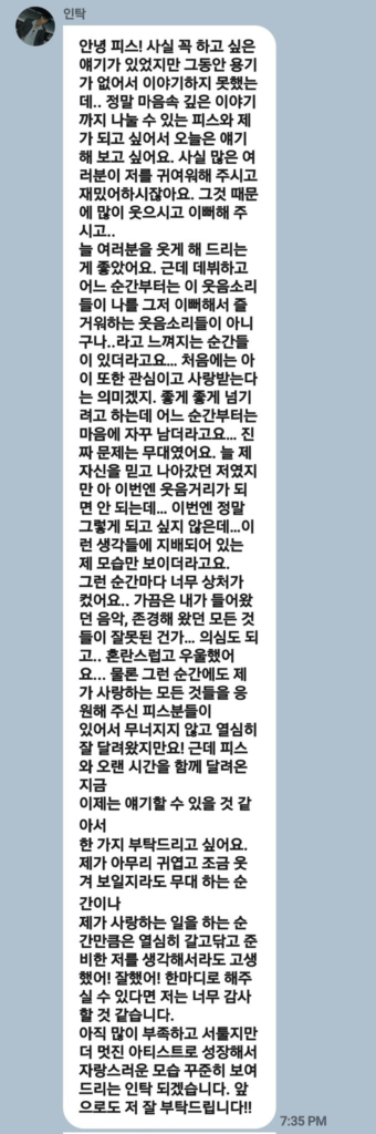 Recentemente, o INTAK (@p1h_official) enviou uma mensagem tocante para os P1ECEs através da plataforma fromm, onde compartilhou sentimentos que vinha guardando desde o debut e fez um apelo para que seu trabalho artístico seja visto com seriedade.