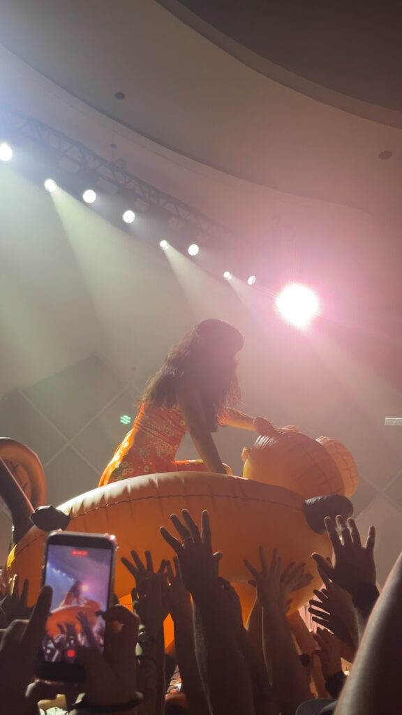 Já se encaminhando para o final do show num dos momentos mais animados da noite, Yoyoyoshie subiu em uma boia em formato de castor, uma brincadeira com o nome da banda, já que beaver significa “castor”, enquanto o público a carregava de um lado a outro.