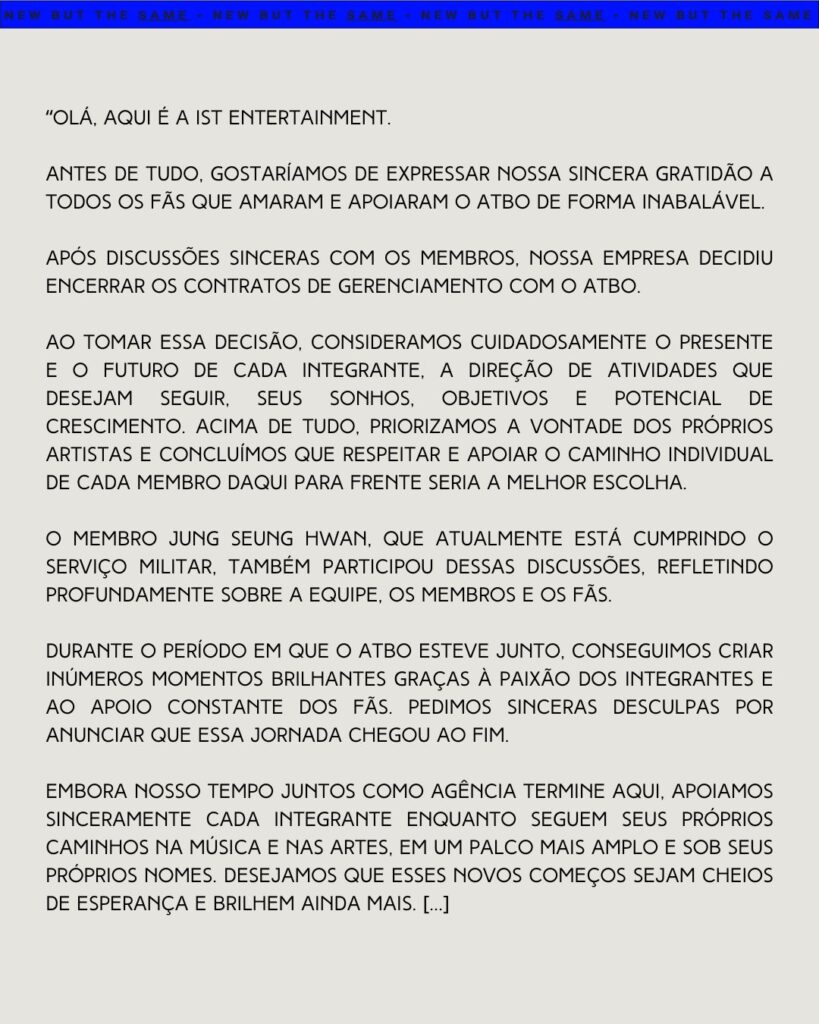 A empresa relembrou com carinho o período em que o ATBO esteve ativo, afirmando que foi possível criar inúmeros momentos brilhantes graças à paixão dos integrantes e ao apoio inabalável dos fãs. A agência expressou pesar ao anunciar que essa jornada conjunta chegou ao fim.