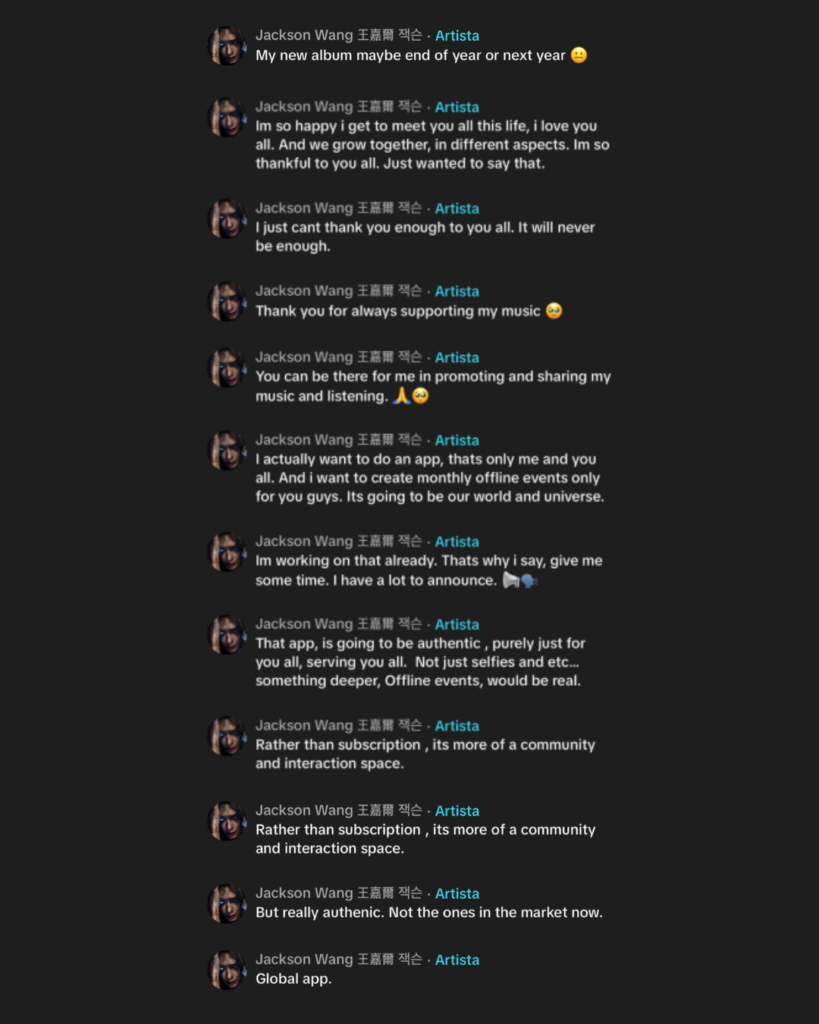 Ontem (14), o rapper, cantor, dançarino e produtor musical Jackson Wang promoveu uma listening party especial, onde conversou com os fãs e fez dois anúncios que deixaram os Jacky’s extremamente ansiosos.