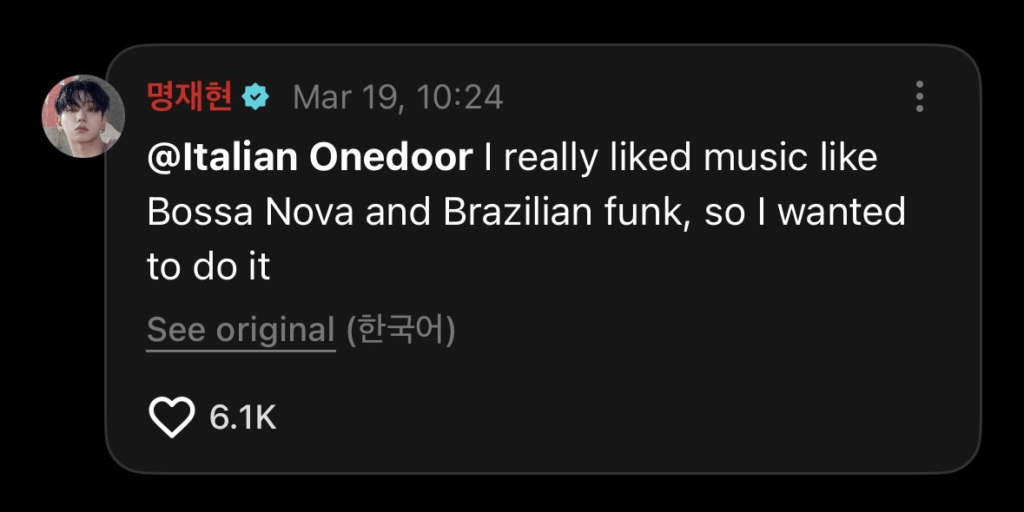 JAEHYUN respondeu ao post de um fã no Weverse, dizendo que tem interesse em músicas do nosso país. “Eu realmente gosto de música tipo Bossa Nova e funk brasileiro, então queria fazer isso”.