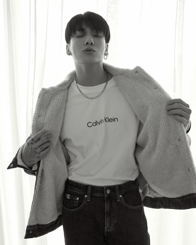 As fotos destacam e realçam a estrutura corporal do cantor, vestindo peças icônicas da Calvin Klein. Em uma das imagens, Jungkook aparece escorado na parede, outra enfatiza movimento e textura e assume uma tonalidade preto e branco. As duas últimas fotos trazem um look all jeans, famoso da marca, e ao brincar com jogo de luzes, criam um efeito quase escultural.