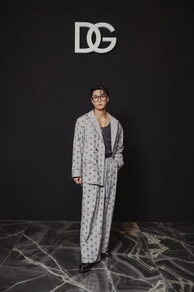 Embaixador global da Dolce&Gabbana, SAN (ATEEZ) compareceu ao desfile reafirmando sua forte ligação com a marca — parceria que já o levou a campanhas oficiais. Seu look manteve a assinatura sensual e dramática característica da grife, com alfaiataria ajustada e elementos barrocos.