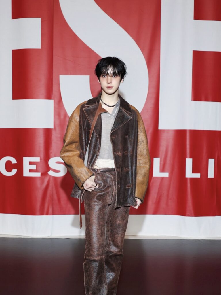 No desfile da Diesel, YUNHO (ATEEZ) representou a energia jovem e rebelde proposta pela direção criativa atual da marca. Com styling utilitário e referências Y2K, YUNHO incorporou a estética denim experimental que vem redefinindo a Diesel nas semanas de moda recentes.