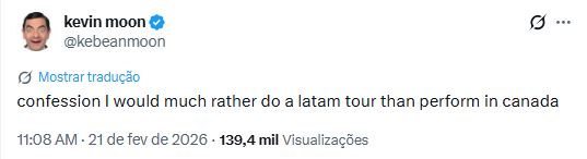 Em desabafo publicado na sua conta no X (antigo Twitter) neste sábado (21), Kevin Moon, integrante do THE BOYZ, afirmou que prefere realizar uma turnê na América Latina a fazer uma apresentação no Canadá.