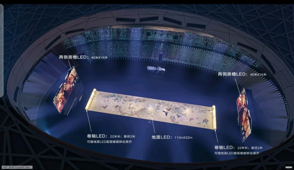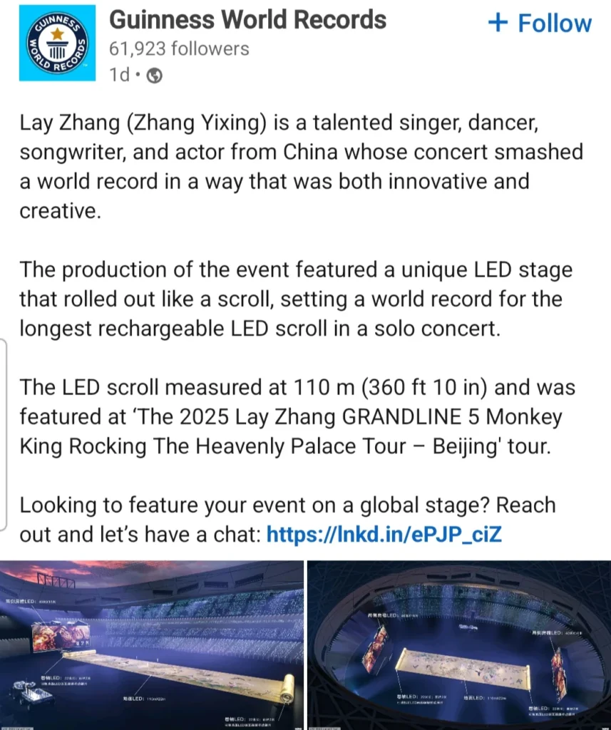 A conquista aconteceu durante a turnê “The 2025 Lay Zhang GRANDLINE 5: Monkey King Rocking The Heavenly Palace”, que apresentou um palco de LED exclusivo projetado para se desenrolar como um pergaminho. A estrutura estabeleceu o recorde de maior pergaminho de LED recarregável já utilizado em um show solo, medindo impressionantes 110 metros (360 pés e 10 polegadas).