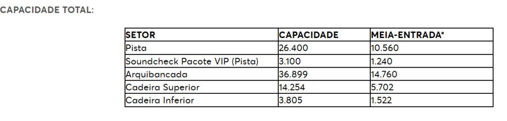 De acordo com informações divulgadas no site oficial da Ticketmaster, responsável pela venda dos ingressos dos shows do BTS no Brasil, as apresentações no Estádio MorumBIS, em São Paulo, terão capacidade para até 84.458 pessoas por dia.